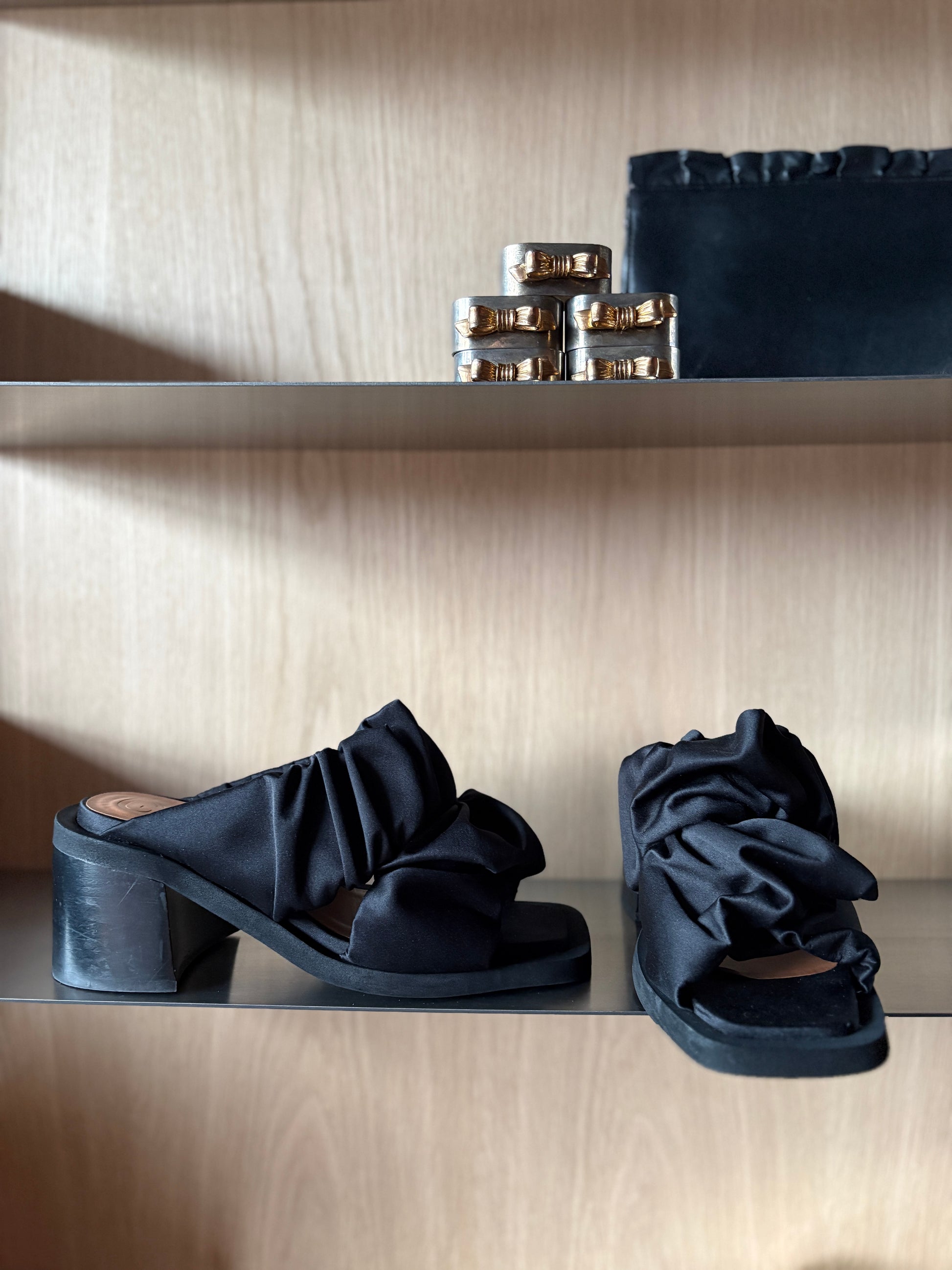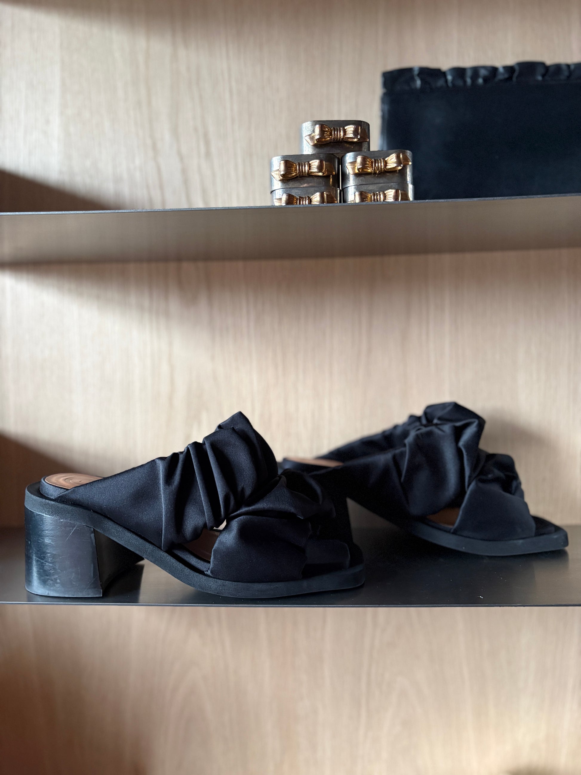 Ganni Black Satin Ruched Mules