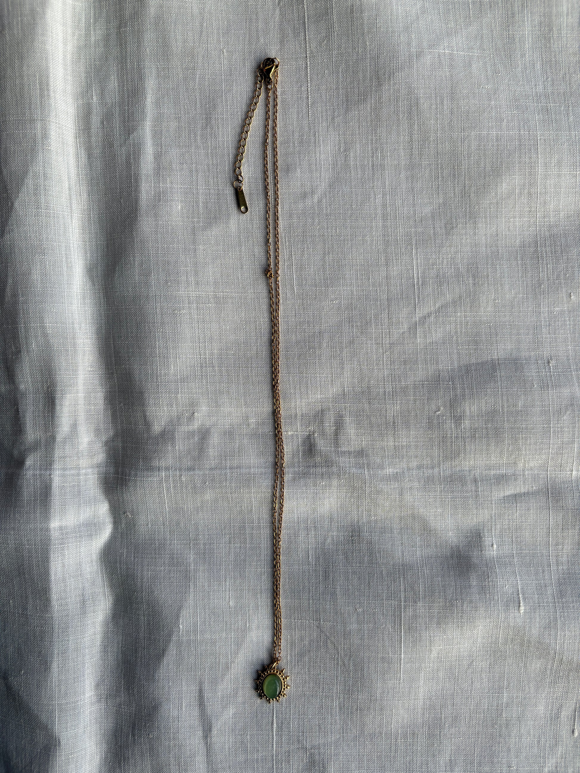 A vintage-inspired treasure, this gold pendant necklace features an oval olive stone with soft, natural warmth. Its delicate, timeless design makes it perfect for layering with other necklaces or wearing alone for understated elegance. A piece that feels like a quiet curiosity discovered in a cherished collection.