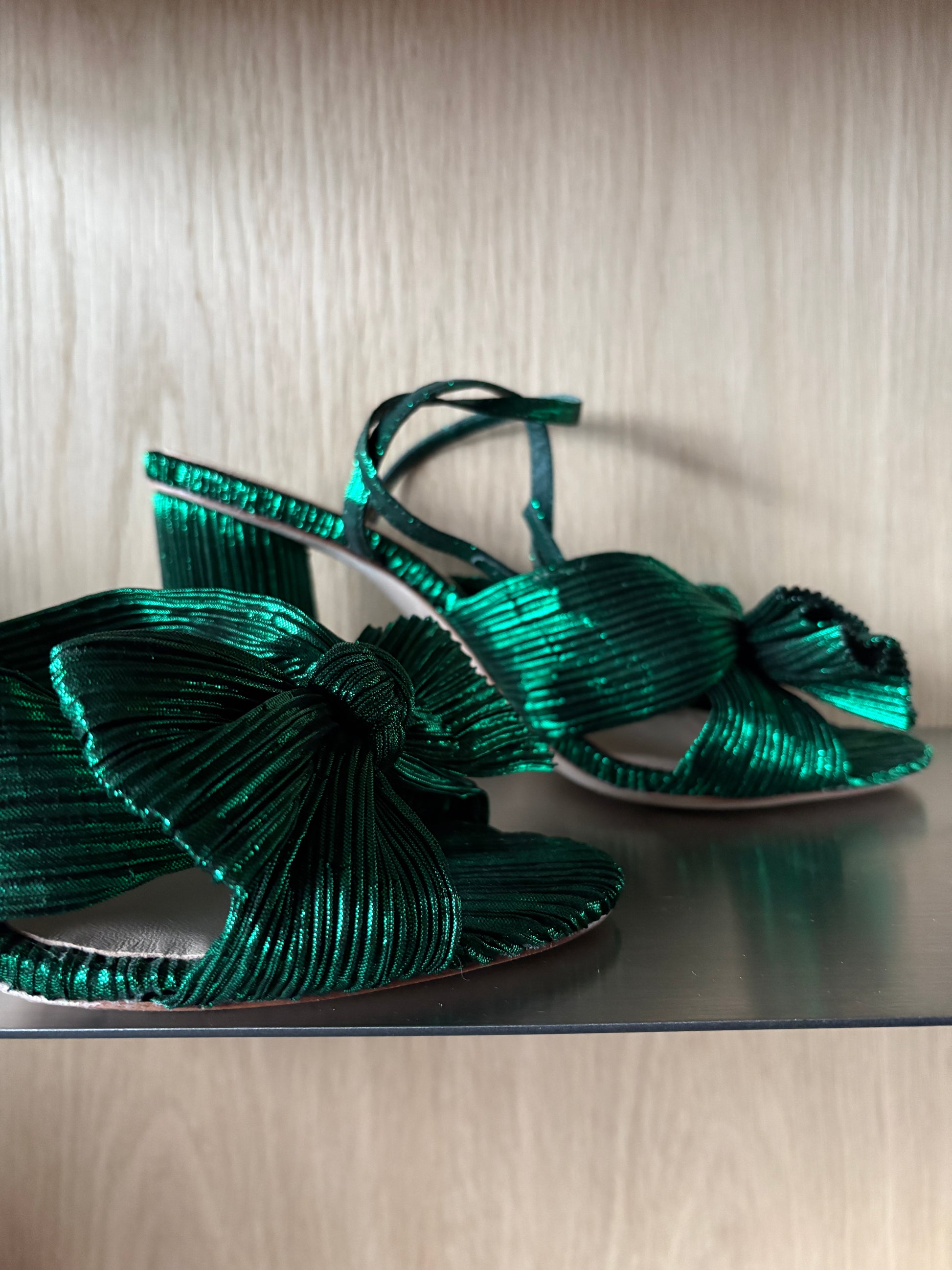 Radiate effortless elegance in Loeffler Randall’s iconic Camellia heels. Designed by Brooklyn based Jessie Loeffler Randall, the brand is celebrated for its modern, feminine aesthetic and beautifully crafted occasion wear. These metallic emerald heels feature the label’s signature pleated bow and elegant block heel, perfect for weddings, parties, and special occasions with the high-price ticket commitment!