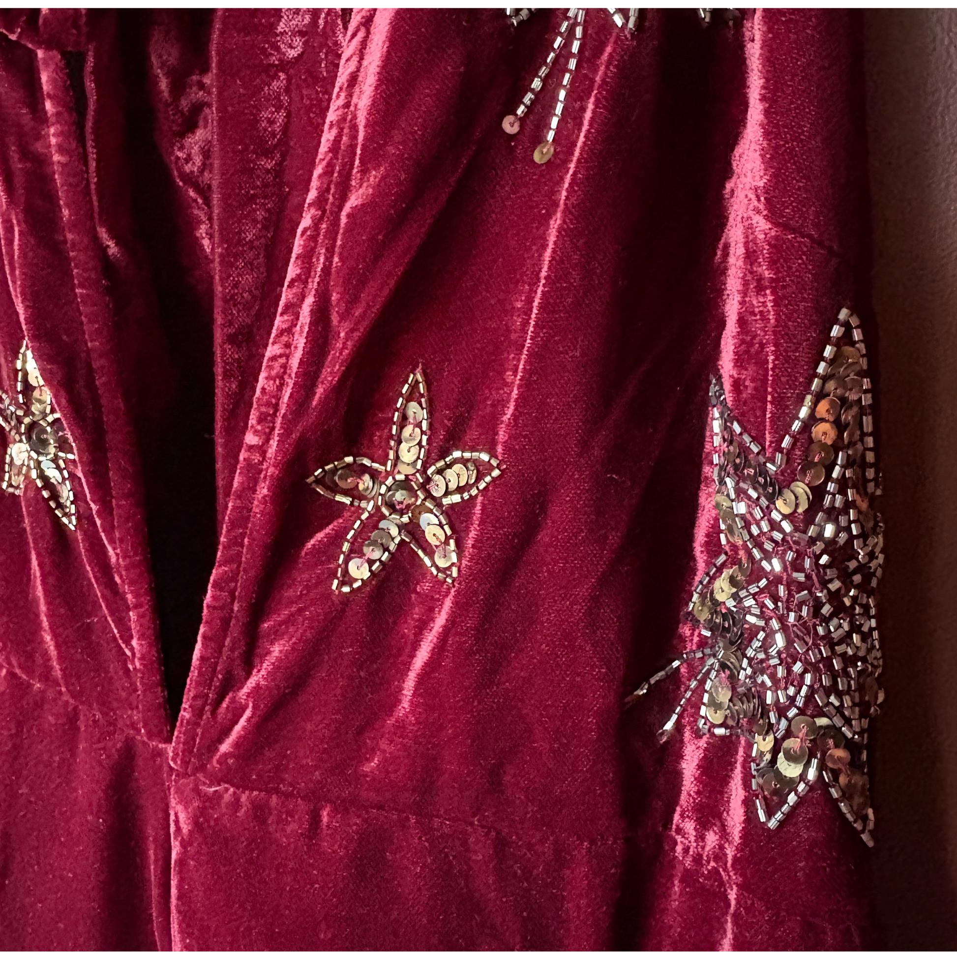 A striking statement jumpsuit from Nasty Gal, this burgundy velvet one-piece channels 70s-inspired Bohemian style. Featuring a halter neckline, wide-leg trousers, and delicate star embellishments, it is the perfect choice for Christmas parties, cocktail evenings, or any celebratory event. All the style without the commitment.
