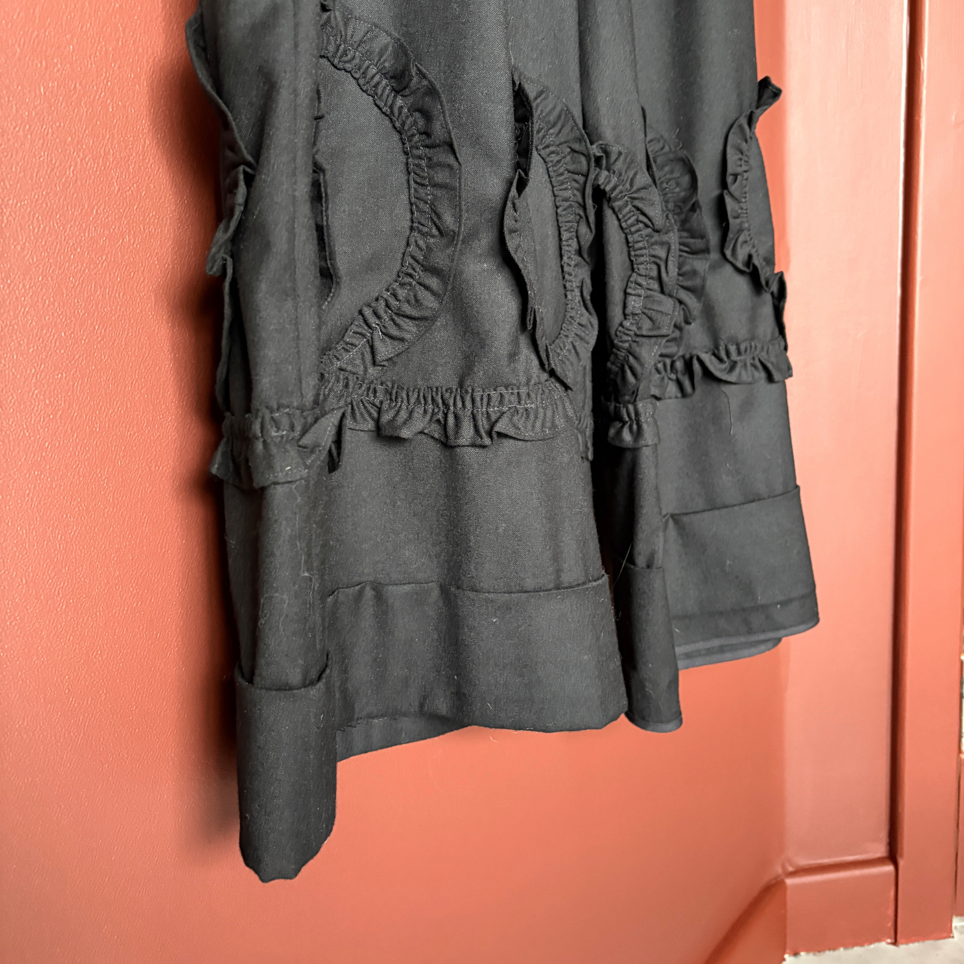 Elevate your wardrobe with SHRIMPS’ Black Wool Frill Wide-Leg Trousers. Made by the London label known for playful, luxurious designs, these trousers feature a high-rise waist, relaxed wide-leg fit, and a delicate frill at the hem shaped like a cameo brooch, adding a hint of vintage-inspired detailing. Perfect for evening drinks, cocktail parties, or festive gatherings, all the style without the commitment.