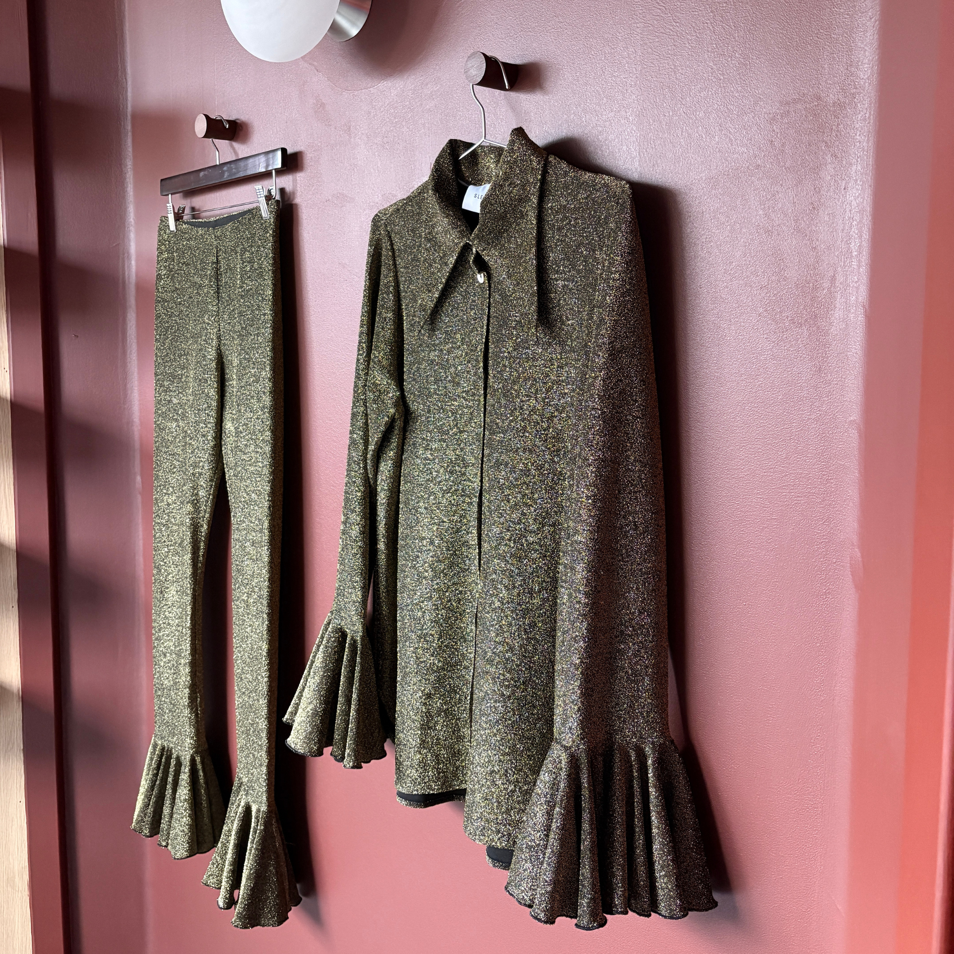 Shine in Sleeper’s Gold Lurex Glitter Co-Ord Set, featuring along-line shirt with a 70s-inspired aeroplane collar and matchy-matchy flared trousers. Crafted in shimmering lurex, this set combines vintage charm with contemporary refinement, making it the perfect festive outfit for cocktail parties, Christmas gatherings, or celebratory events, all the style without the commitment.