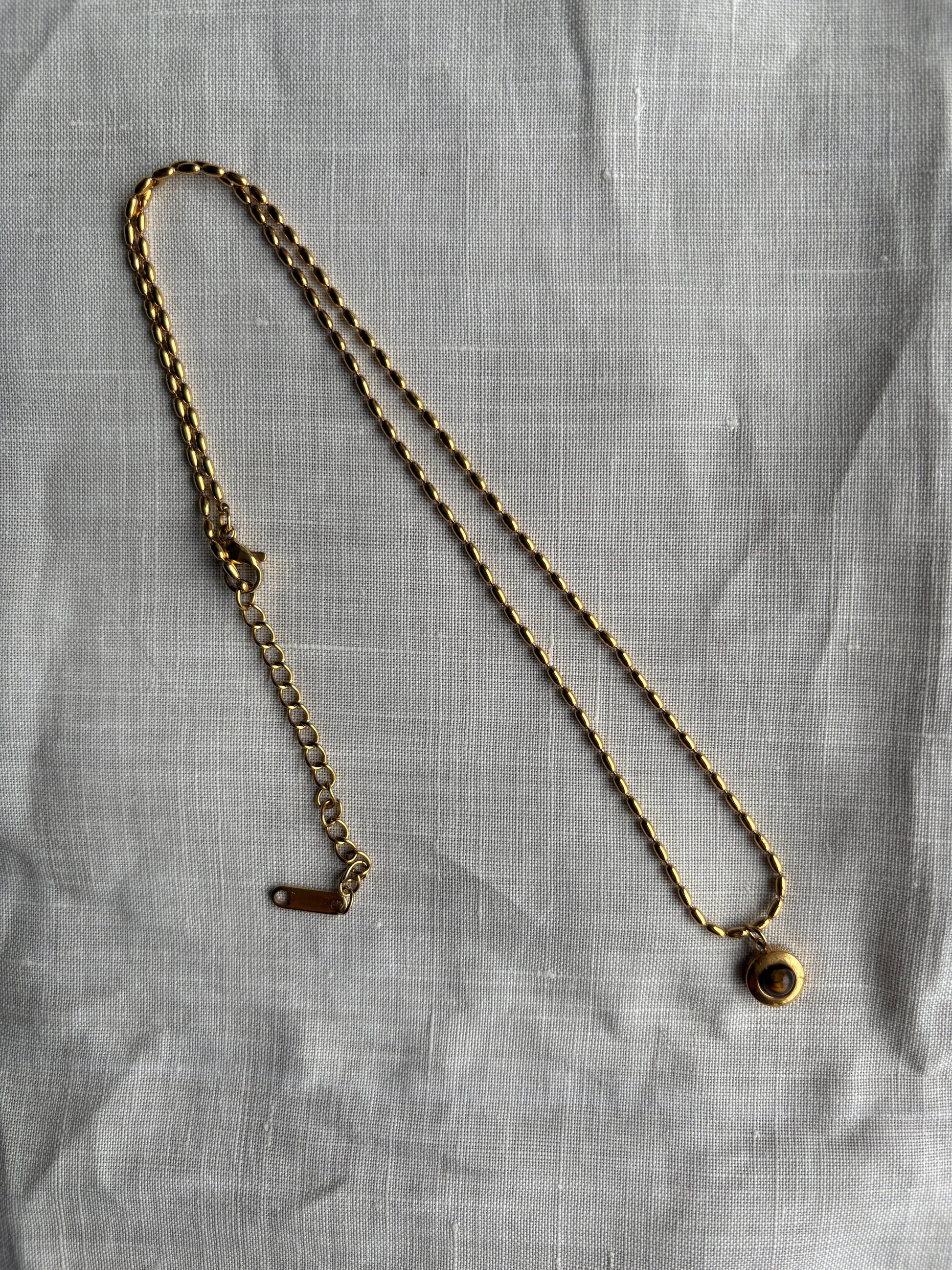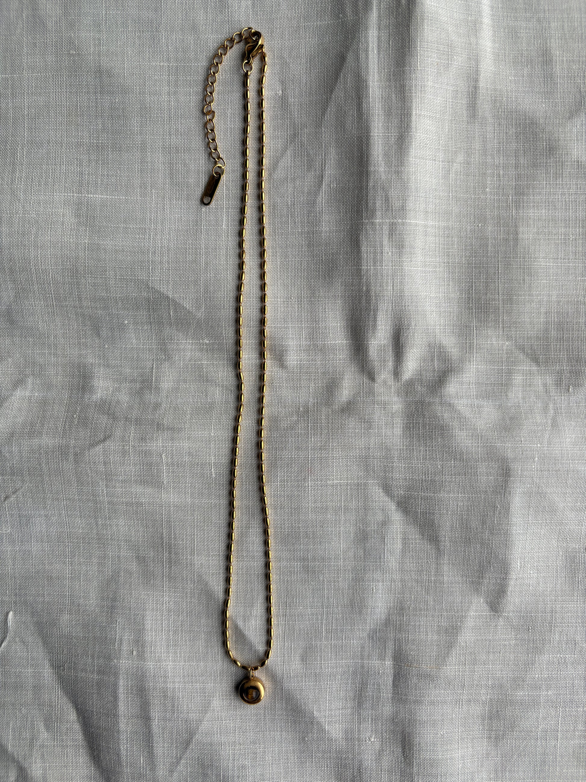A vintage gold chain necklace with a delicate beaded chain and a small circular pendant with an amber colour stone inset. Perfect worn alone or layered with your favourite necklaces, with gentle signs of vintage wear that add character and charm.