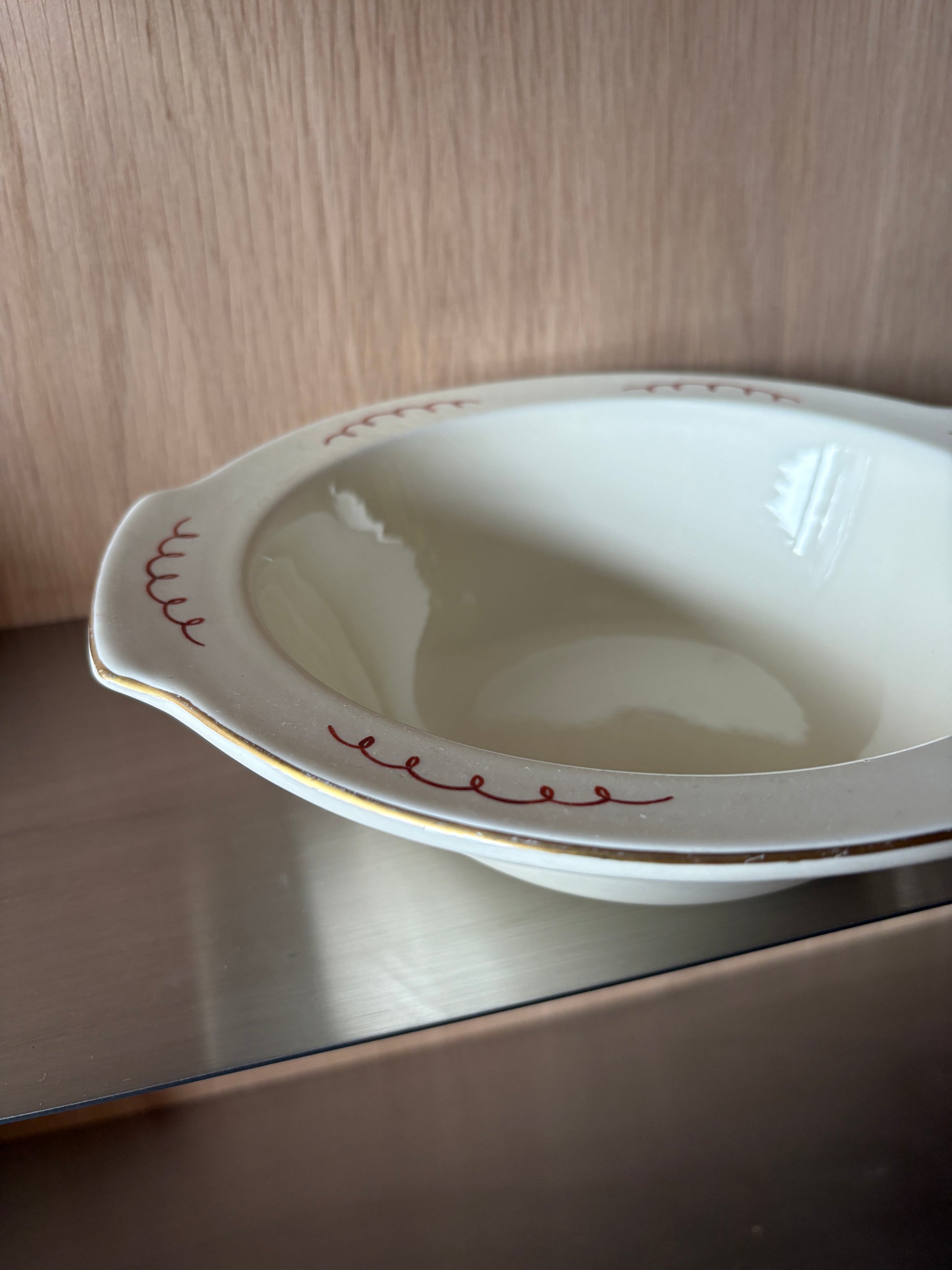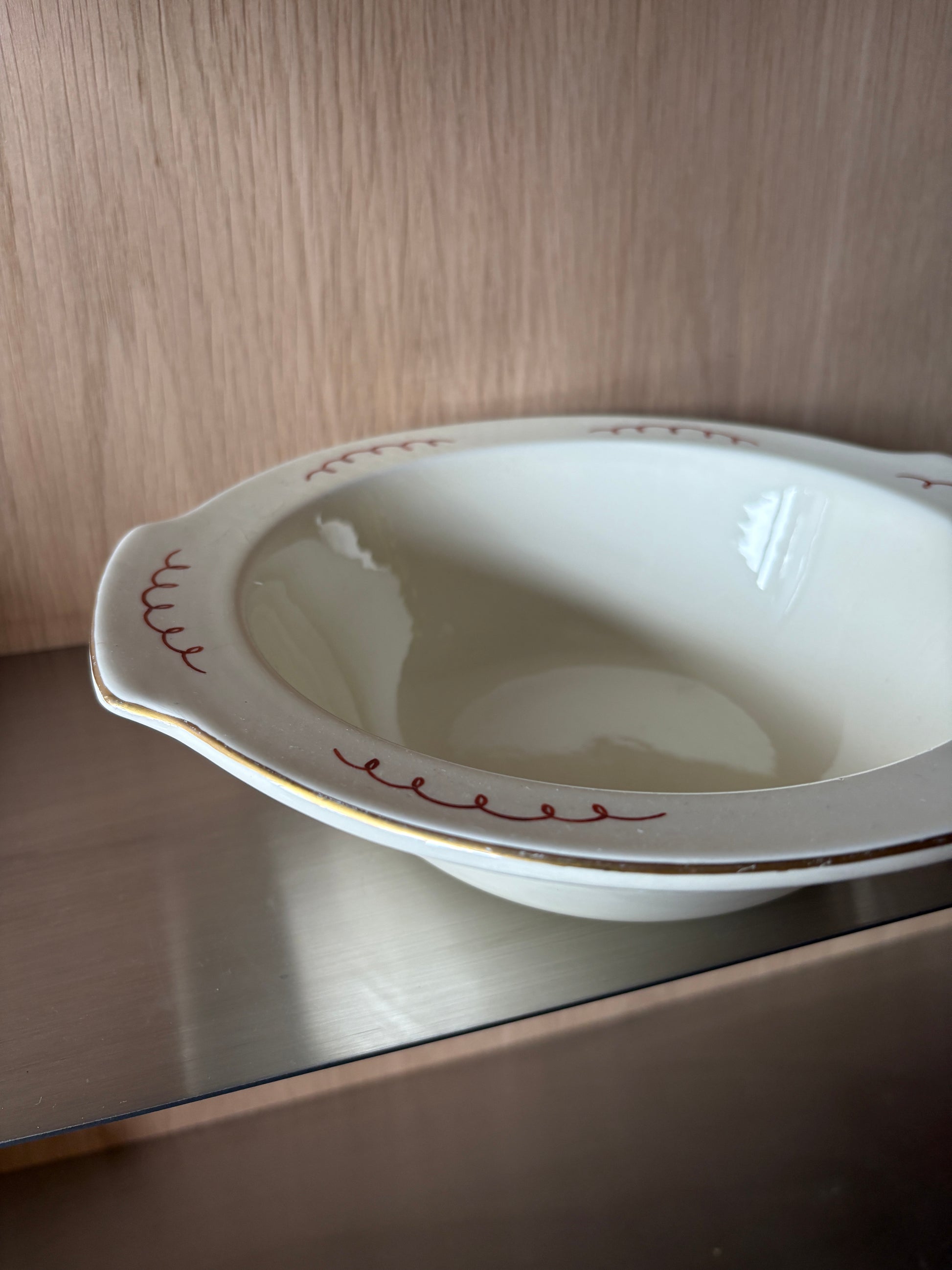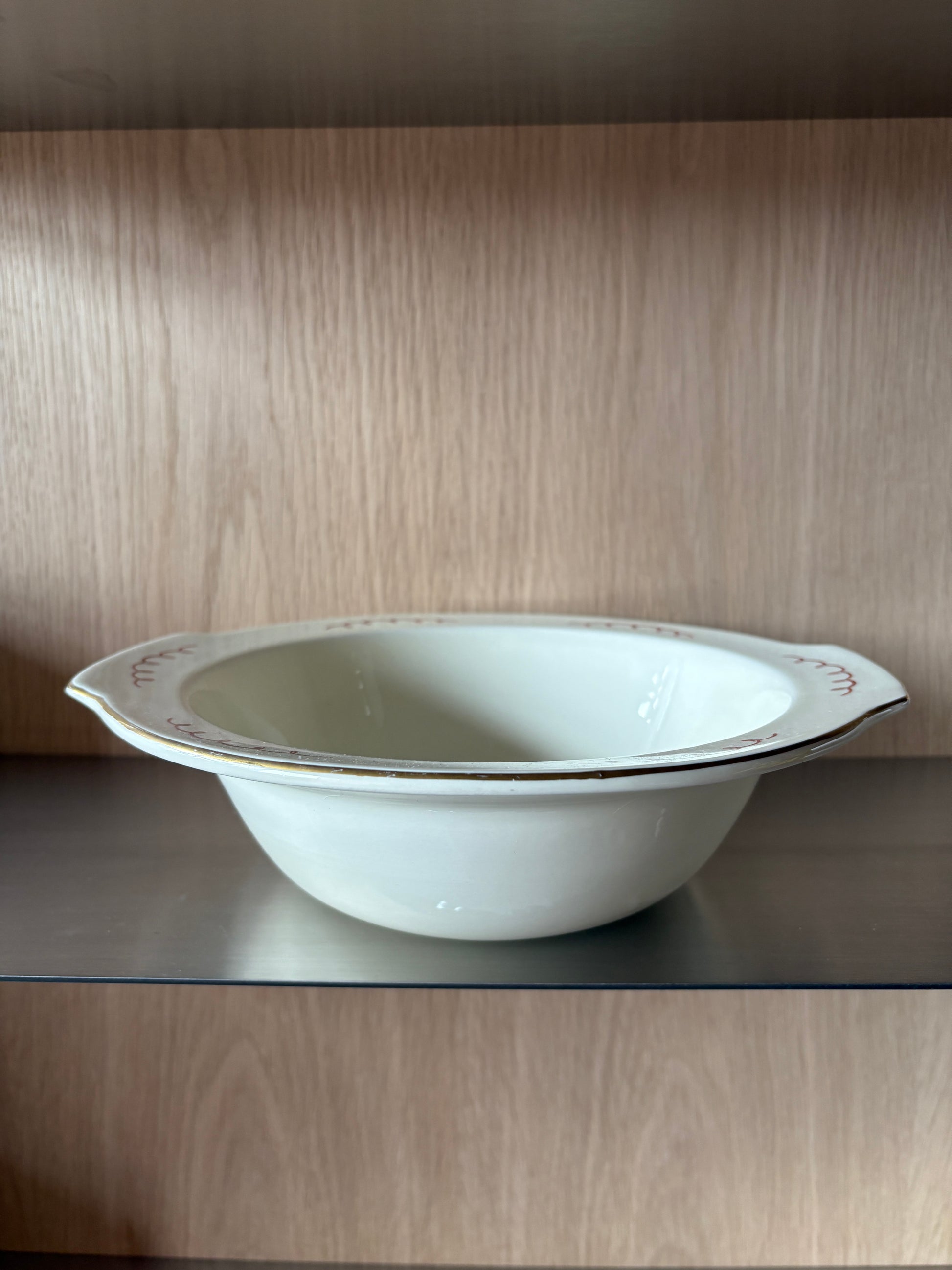 A charming piece with character, this vintage handmade bowl features a distinctive crackle glaze and playful wiggle design. Perfect as a serving bowl for sharing dishes or holding festive favourites like Roses or Quality Street chocolates.