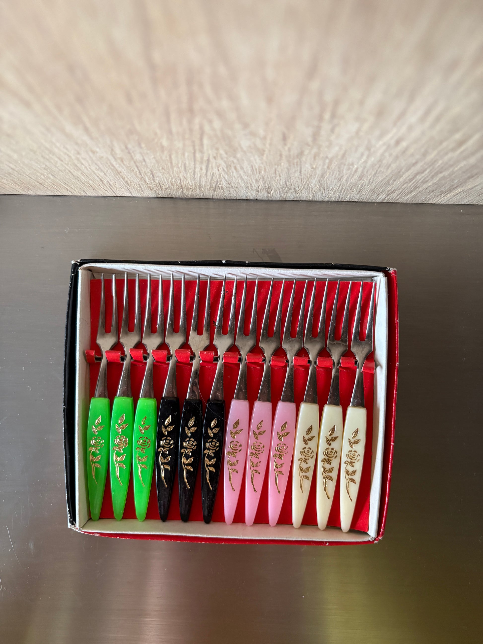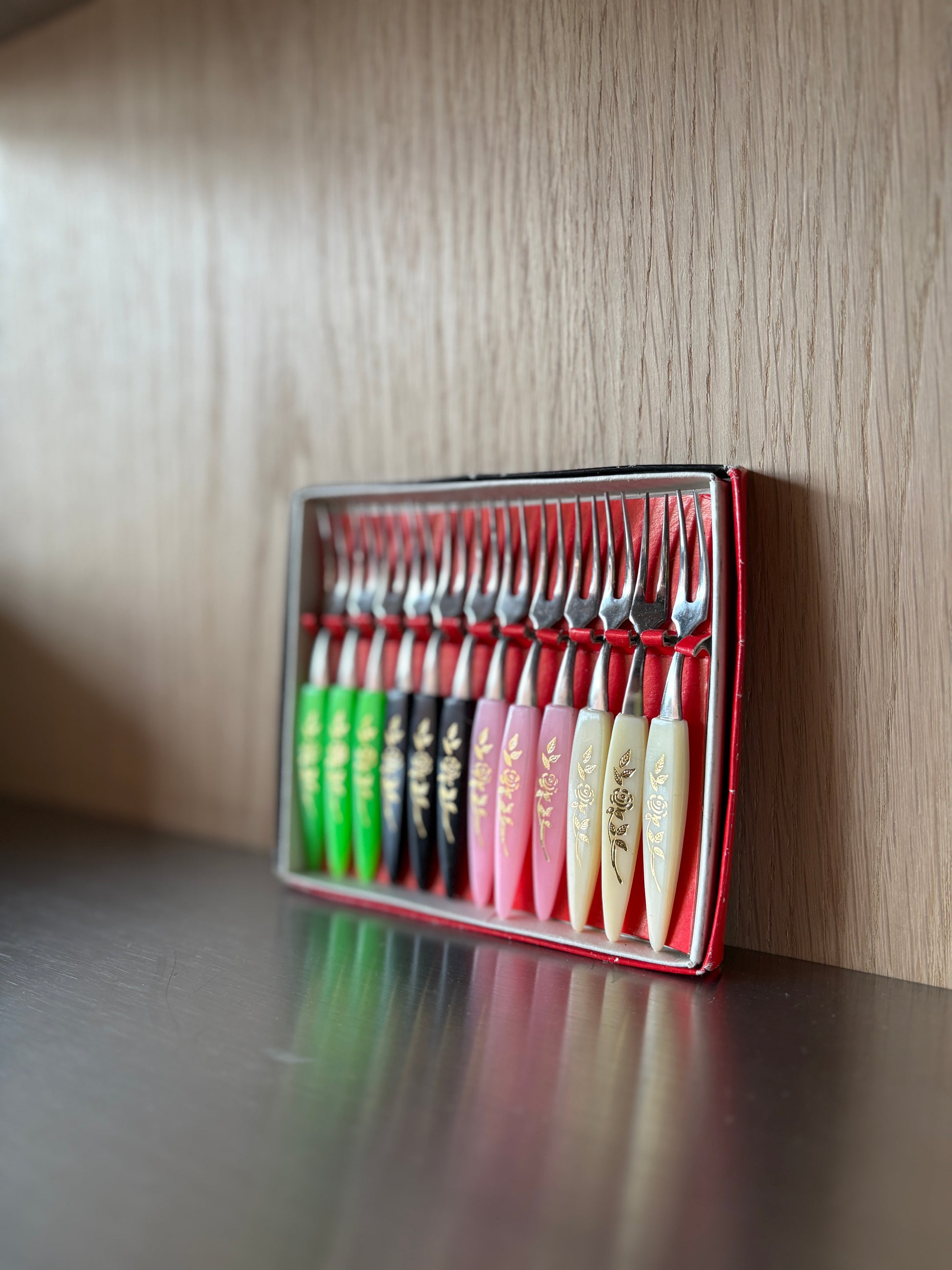 Add a touch of vintage elegance to your table with this set of 12 hors d’oeuvres forks. Still in their original box, each fork features a delicate gold leaf floral design, perfect for serving canapés, appetizers, or finger foods at any gathering.