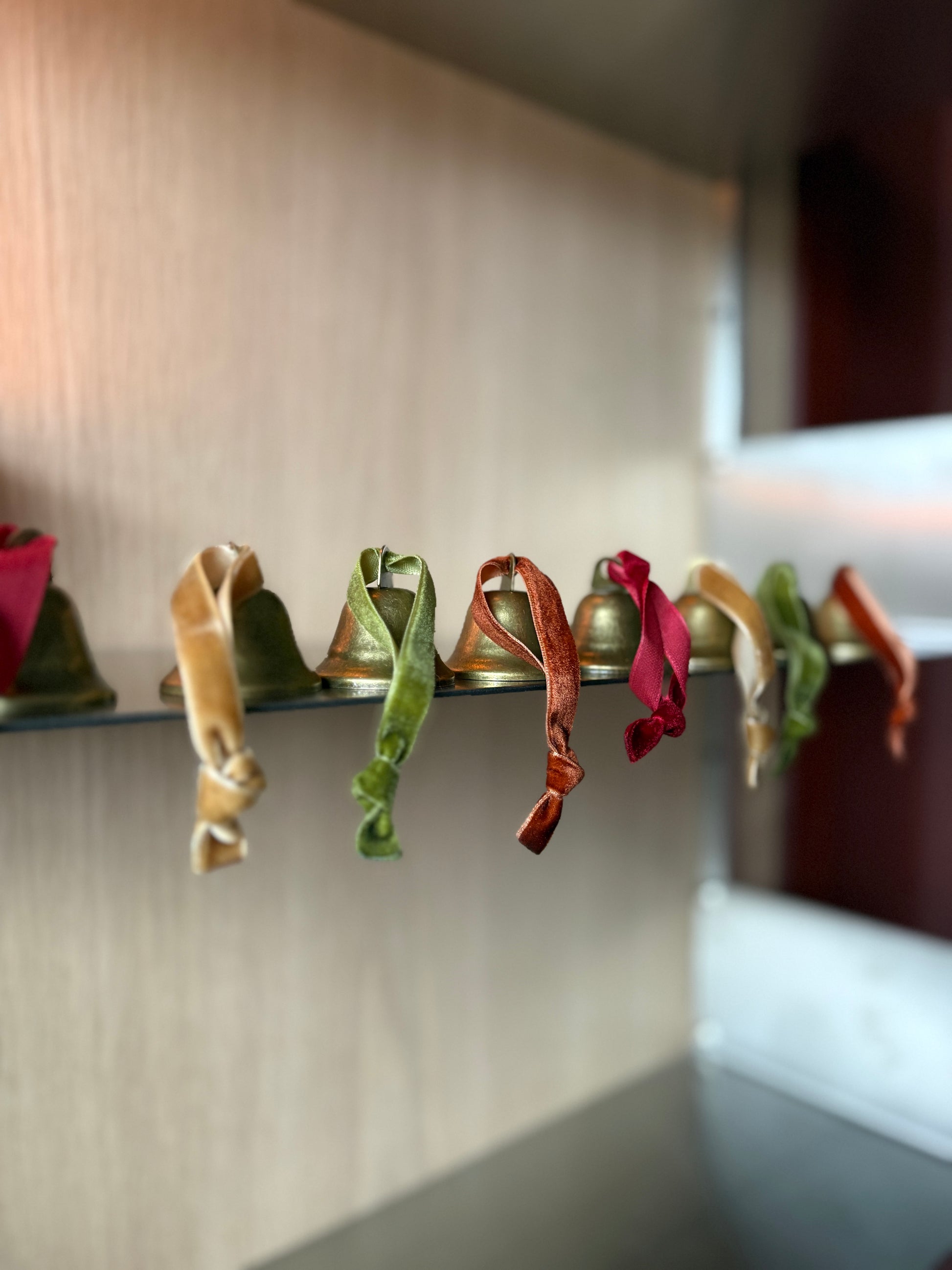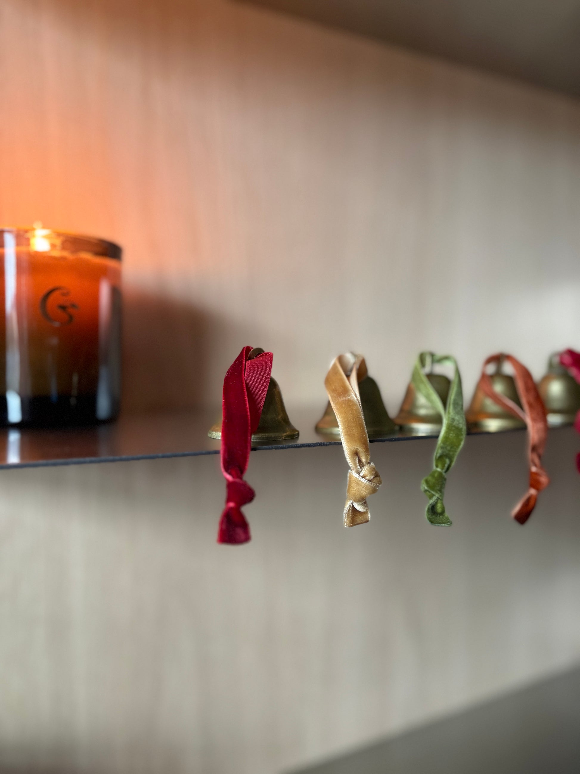 Bring nostalgic charm to your Christmas with this set of eight mini antique brass bells, each tied with a rich jewel-coloured velvet ribbon. Perfect for trees, mantels, or gift wrapping, these little details add warmth, sparkle, and a soft jingle to your festive season.