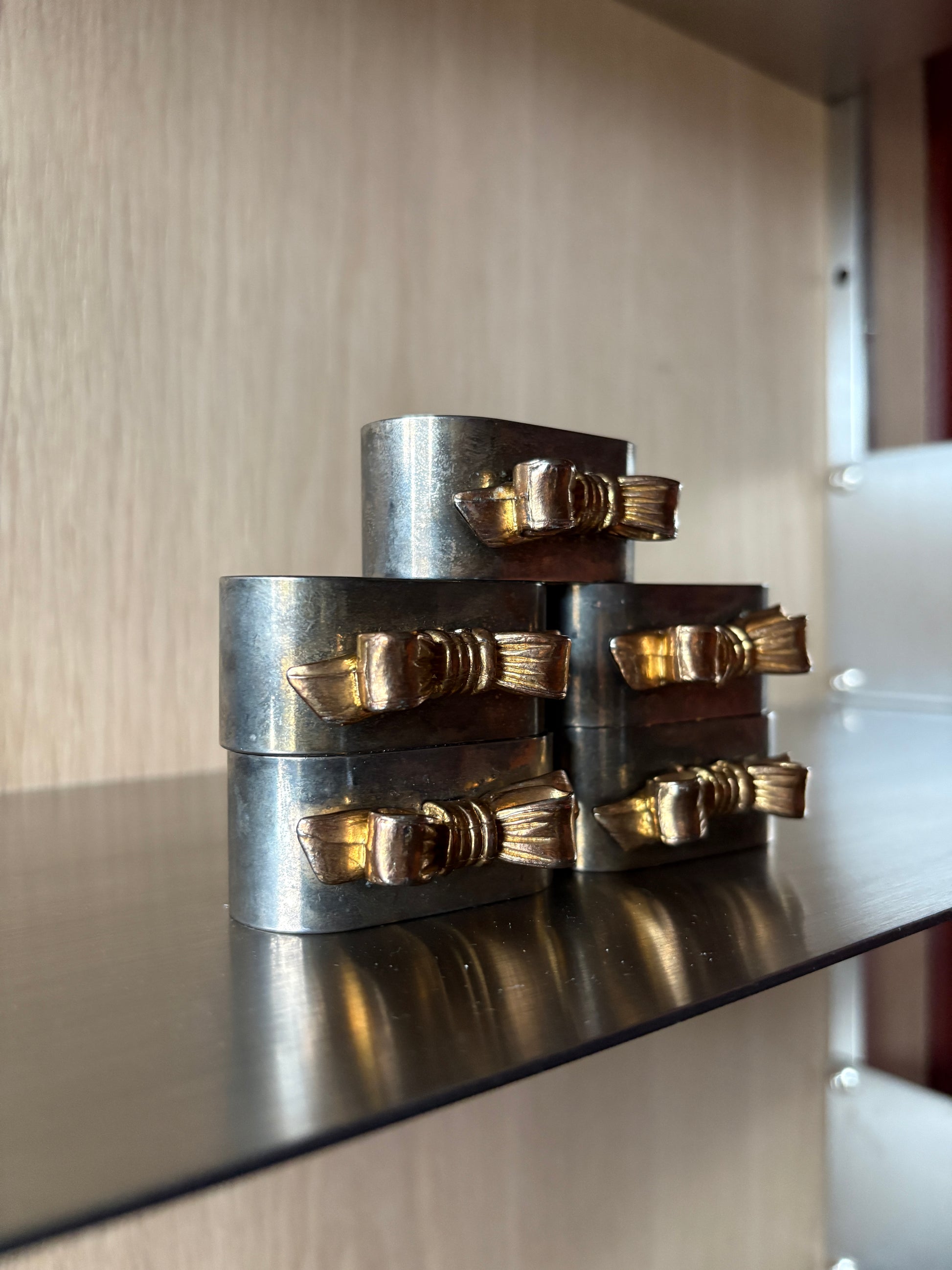 Table details that feel thoughtful. Bring a touch of festive magic to your Christmas table with these vintage stainless-steel napkin rings, each with a delicate gold bow.