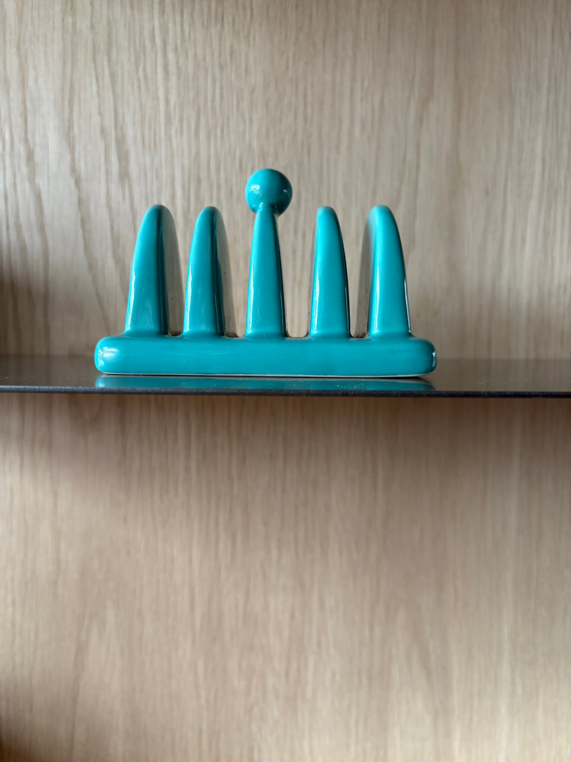 Bring a touch of folk charm to your table with this vintage curved ceramic toast rack. Handcrafted and glazed in a vibrant teal.